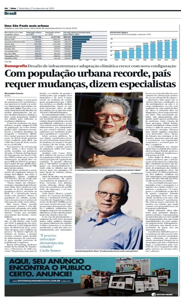 O conceituado jornal “Valor Econômico” publicou, na edição de 27 de dezembro a reportagem “Com população urbana recorde, País requer mudanças, dizem especialistas”, escrita pela jornalista Alessandra Saraiva. O texto chamou a atenção do diretor de Assuntos Regionais da AELO, Elias Zitune, que tratou de alertar o AELO ON. “Essa reportagem tem bastante relação com a atividade que os associados da AELO exercem”, argumentou Elias.