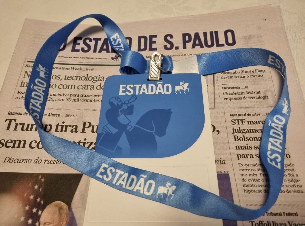 Esta ilustração é uma foto em que aparece, sobre a primeira página do “Estadão” do último sábado, o modelo da credencial destinada, em 2024, aos inscritos para acompanhar o 1.º Fórum de modo presencial.