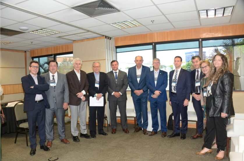 O Secovi-Goiás e a Associação de Desenvolvedores Urbanos de Goiás (ADU-GO) reforçaram no Fórum de 6 de outubro a condição de autênticas parceiras da AELO. Aqui está uma foto tirada logo após o evento. Pela AELO, aparecem o presidente Caio Portugal, o terceiro da esquerda para a direita, e o vice-presidente, Luis Paulo Germanos, na ponta-direita. O presidente da ADU-GO, João Victor Silva Araújo, é o segundo, da esquerda para a direita. O presidente do Secovi-Goiás, Antônio Carlos da Costa, que participou do debate de abertura, é o sexto. À esquerda dele, surge o arquiteto Ioav Blanche, que já exerceu vários cargos nas entidades goianas. À direita de Caio, o desembargador Jeronymo Pedro Villas Boas, que participou do segundo painel.