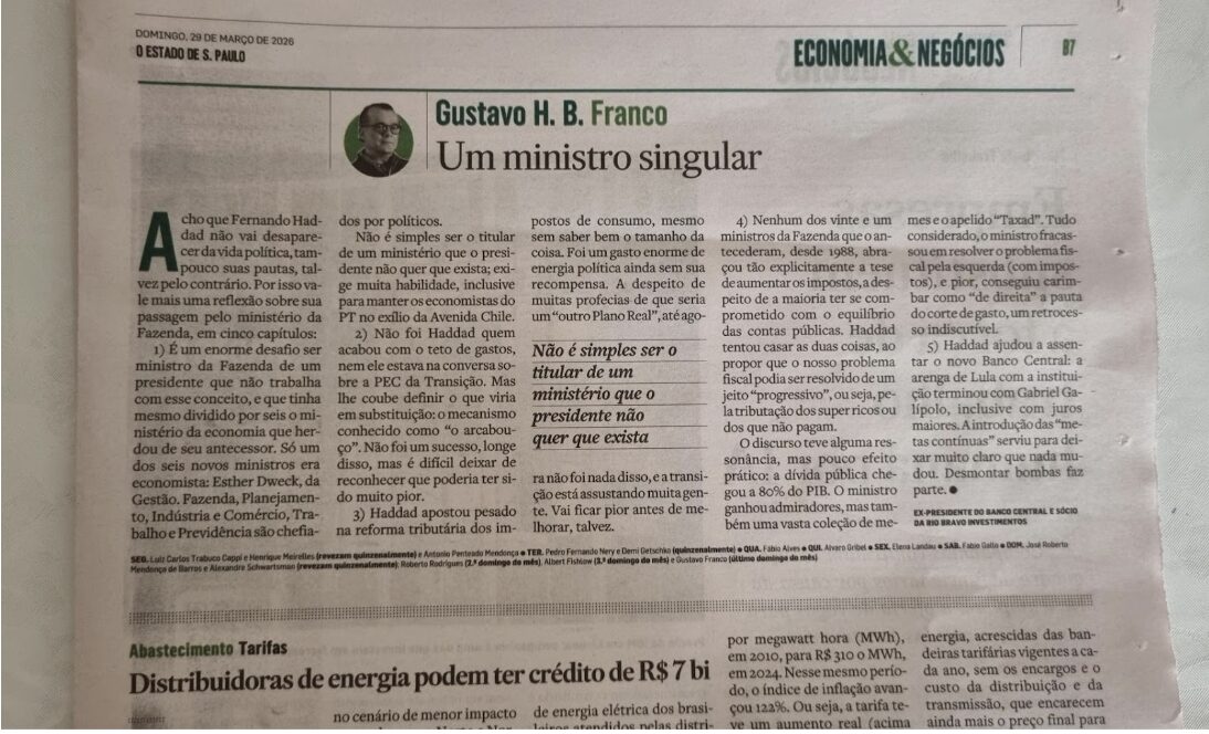 Gustavo Franco, que escreve artigos opinativos para os jornais “Estadão” e “O Globo”, publicou no domingo, 29 de março, o texto “Como foi a passagem de um ministro singular pela Fazenda, em cinco capítulos”, em que analisa a gestão de Fernando Haddad no governo Lula e faz advertências ao Brasil. Ele não é um simples articulista. Na verdade, Gustavo Henrique de Barros Franco, carioca, 69 anos, economista, professor do Departamento de Economia da PUC-Rio, pós-graduado em Harvard (EUA), foi presidente do Banco Central (BC) de 1997 a 1999. Sua gestão à frente do BC, no governo de Fernando Henrique Cardoso, foi considerada positiva.