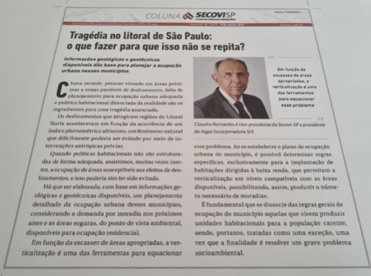 Em engenheiro Claudio Bernardes, vice-presidente do Secovi-SP e membro do Conselho Consultivo da AELO, escreveu em março de 2023 um artigo com reflexões sobre a tragédia do Litoral Norte de São Paulo, publicado pela Coluna do Secovi-SP no jornal “Estadão” e reproduzido no AELO ON naquela época.