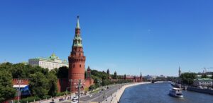 Num passeio até a histórica Praça Vermelha, em dia de céu azul, caminhei por uma das pontes sobre o Rio Moscou e tirei esta foto. Nela, se destacam as muralhas do Kremlin e o Palácio Presidencial, onde Putin já arquitetava maldades.