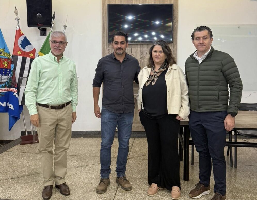 A foto mostra, da esquerda para a direita, o arquiteto José Maria Antunes Felix Pereira, da JFD; o secretário de Infraestrutura de Franca, Luiz Henrique Spirlandelli; a engenheira Beatriz Codas, da Geasa Engenharia, e Jorgito Donadelli. O seminário atraiu o interesse também da Prefeitura de Batatais, representada pelo secretário de Obras e Planejamento, Orion Francisco Riul Júnior.