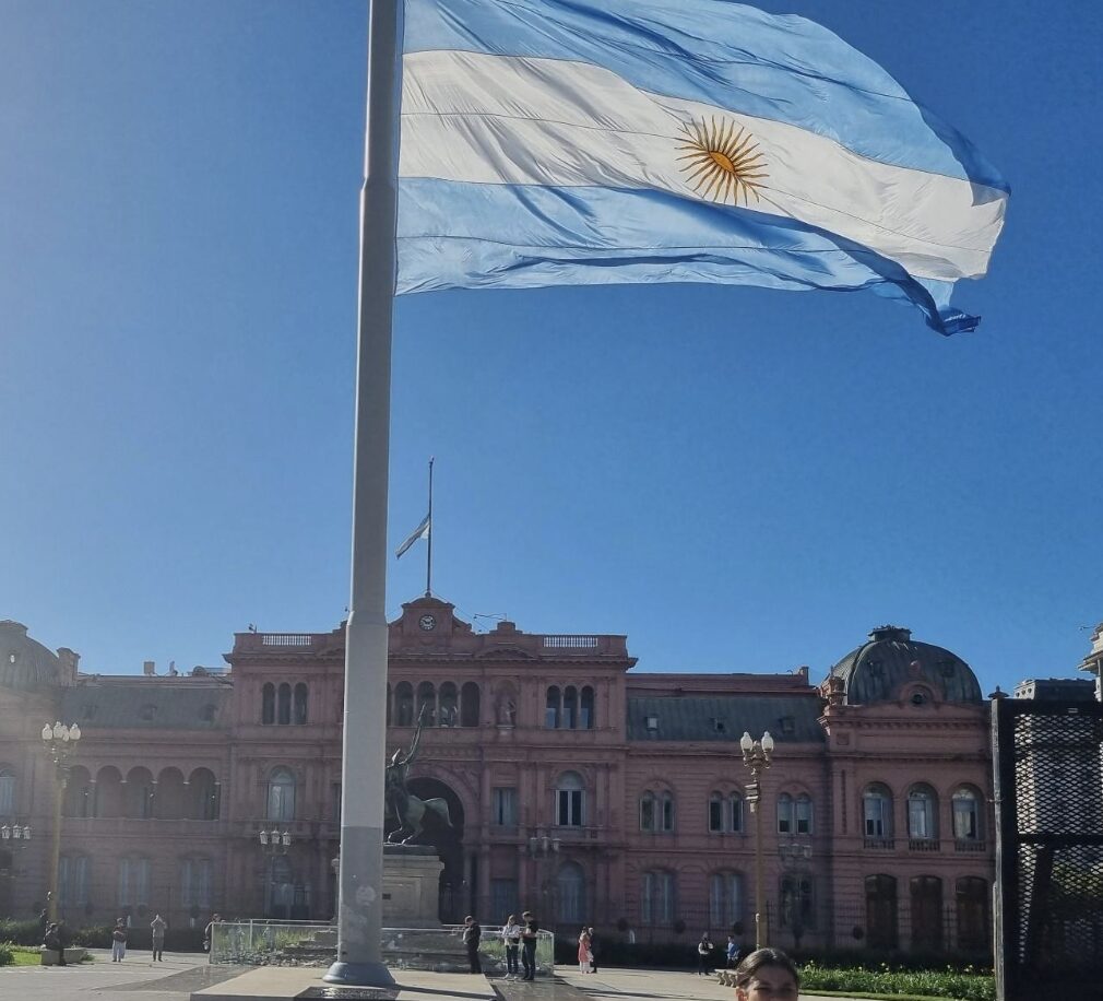 Uma gigantesca bandeira (foto) tremula ao vento, diante da Casa Rosada, edifício do qual inúmeros presidentes discursaram para multidões desde o líder Juan Domingo Perón (1946-1955) e sua esposa, Maria Eva Duarte de Perón, a Evita – famosa nos tempos de poder e idolatrada ao morrer, de câncer, em 1952, com apenas 33 anos.